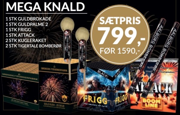 Mega Knald er pakken til dig, der vil have lidt af det hele i den vilde ende. Her får du en gennemført blanding af mellem og store batterier, flotte raketter og kraftige bomberør, så du kan lave et helt show uden at tænke på resten.